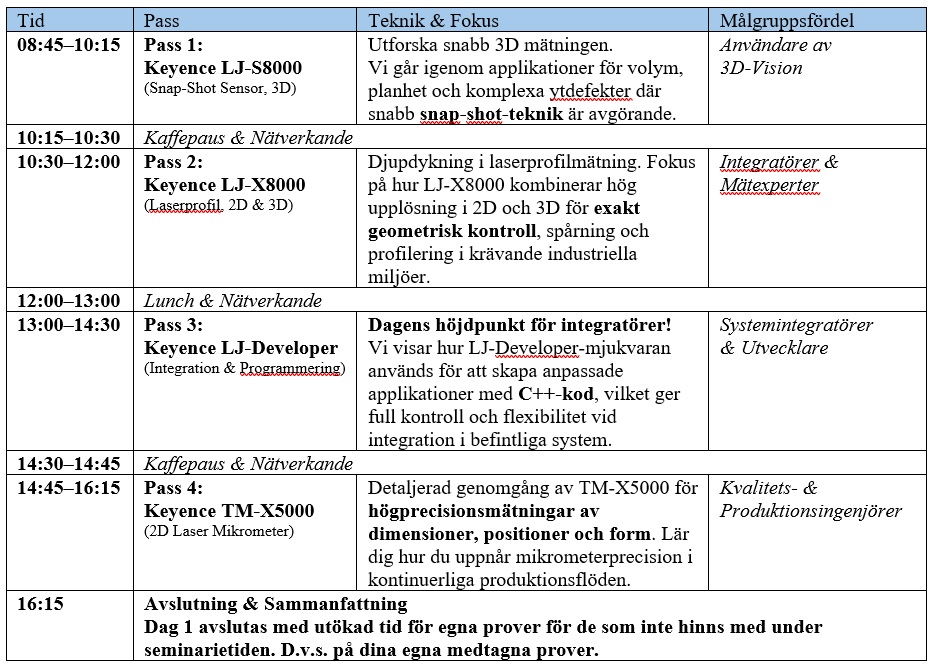 Vi bjuder in till ett specialistseminarium där vi fokuserar helt på Keyence banbrytande mätsystem inom 2D och 3D. Dessa dagar är skräddarsydda för dig som är integratör, utvecklingsingenjör eller teknisk chef och vill lära dig hur du implementerar nästa generations 2D- och 3D-mätningar i komplexa automationsprojekt.